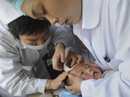 A doctor examines a seriously ill child who is infected with a kind of intestinal virus, identified as EV71, in Fuyang, East China's Anhui Province, April 29, 2008. The ministry of Health has sent two expert teams to Fuyang to help, and progress is being made in researching the virus and its treatment. [Xinhua]