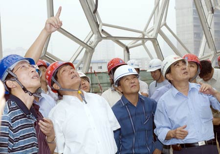 Liu Qi (2rd, Left) is briefed on construction of Olympic venues. Liu,