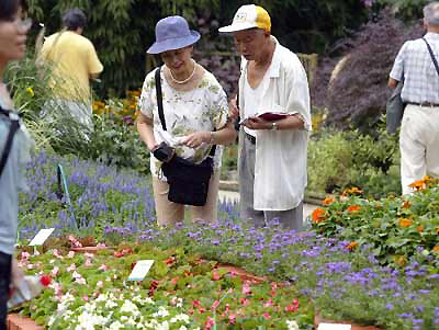 Visitors enjoy watching flowers at the horticultural show in the Purple Bamboo Garden in Beijing August 3, 2006. [CRIENGLISH/Xinhua]