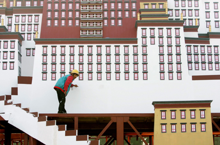 man works in front of a replica of Tibet's Potala Palace in Tiananmen Square