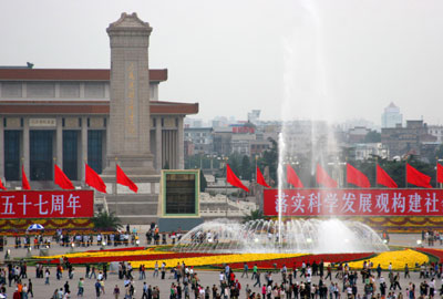 Scenery flowerbeds and fountains are installed in Tian'anmen Square to mark the coming National Day on October 1. [newphoto]
