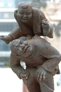 A statue of Chinese boy doing physical exercise on the back of his