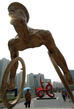 A bronze statue of a disabled athlete in the Olympic game is seen prior to an