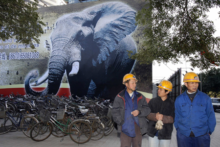 Construction workers walk past a poster promoting the upcoming China-Africa