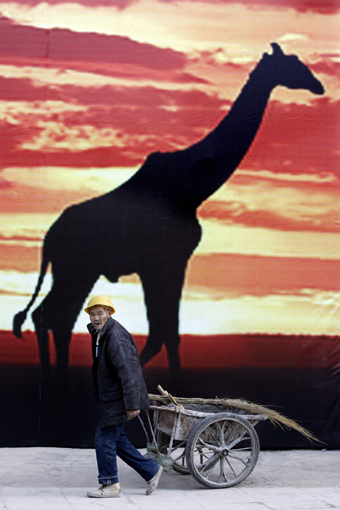 A worker pulls a cart past a poster promoting the upcoming China-Africa