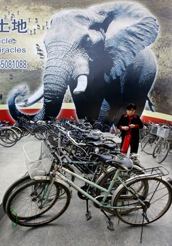 A woman parks her bicycle in front of a poster promoting the upcoming