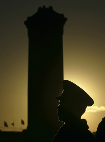 A soldier stands guard in front of the Monument to People's Heroes, outside the Great Hall of the People where the China-Africa Summit in taking place in Beijing, November 5, 2006. China will offer $5 billion in loans and credits, and double aid to Africa by 2009, President Hu Jintao said on Saturday. [Reuters]