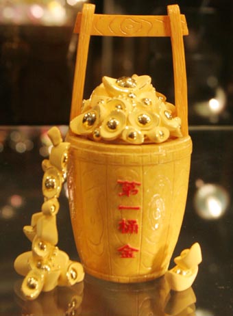 This 'bucket of gold', made entirely of gold, was on display at the China International Jewelry Exhibition on November 8, 2006. The exhibition was the first to be held at the China International Exhibition Centre in Beijing. [newsphoto] |