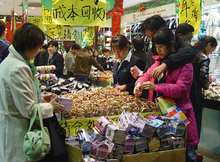 Customers shop in a shopping mall in he commercial district of Wangfujing,