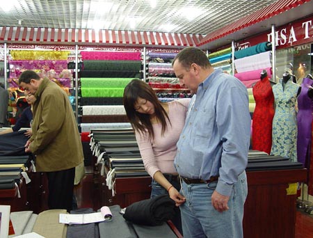 A salesgirl measures customer in a silk store in Sanlitun,Beijing,November