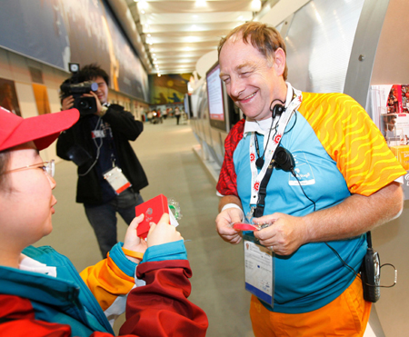 Zhang Dandan (L),a student of Beijing International Studies University,presents a Beijing 2008 Olympics volunteer bedge to an Asian Games staff in Doha Asian Games media centre December 4,2006. In total of 12 volunteers chosen by China Communist Youth League Beijing Committee have served from November 28 to December 9 for the 15th Doha Asian Games, providing part of language services and reception works.[Xinhua]
