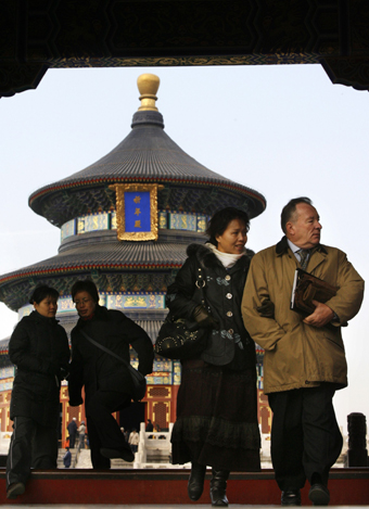 Foreign and local tourists visit the Temple of Heaven in Beijing December 5, 2006.[Reuters]