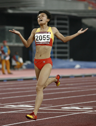 China's Xue Fei celebrates after crossing the finish line to win the women's 5000m final at the 15th Asian Games in Doha December 11, 2006. [Reuters]