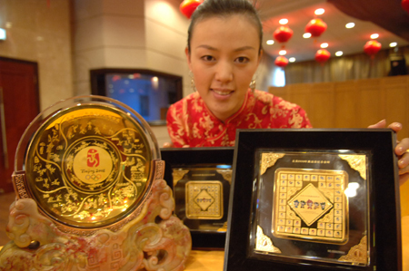A salesperson poses with a gold plate and gold brick embossed with the Beijing Olympic symbol in Beijing, December 15,2006.The Olympic gold plate (L) and set of Olympic gold and sliver bricks unveiled today are licensed by the Beijing Organizing Committee for the Games of the XXIX Olympiad (BOCOG), and are the first gold plate and gold brick set in Olympic history.[newsphoto]