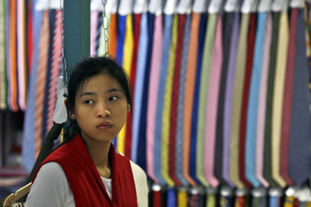A Chinese vendor waits for customers at the entrance to her shop in a market
