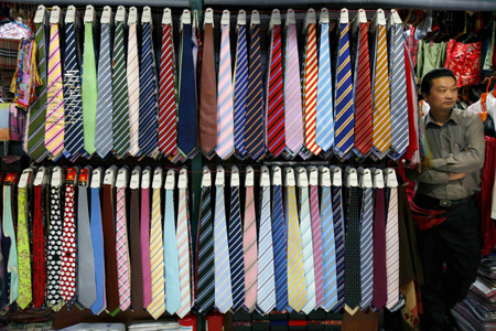 A Chinese vendor waits for customers at the entrance to his shop in a market