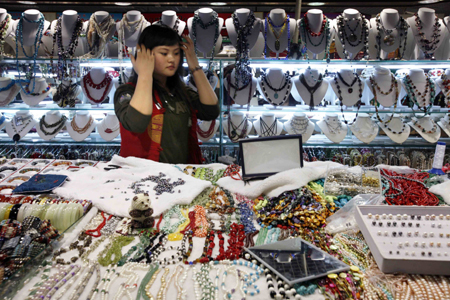 A Chinese vendor waits for customers at her shop in a market in Beijing