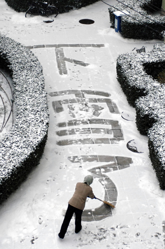 A Beijing citizen with besom writes Chinese reading: It is snowing as she