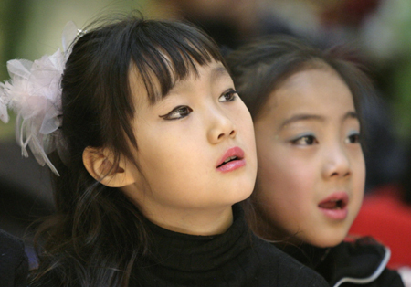 Participants in a child modelling competition watch the performance of other contestants in Beijing January 13, 2007. The competition was held at the end of a model training course for about 200 children aged 4 to 16, during which they underwent physical training and received instruction on stagecraft and various kinds of dances such as step dance and ballet. [Reuters]