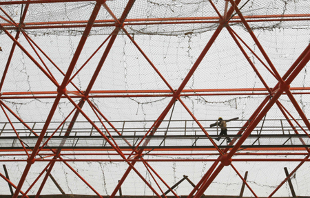 A workers walks at the roof of the construction site for the new terminal of Beijing's International Airport January 19, 2007. [Reuters]