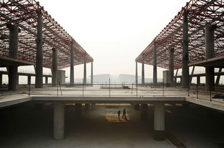 Workers walk at the construction site for the new terminal of Beijing's International Airport January 19, 2007. [Reuters]