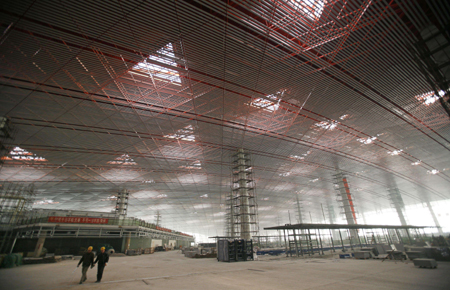 Workers walk at the construction site for the new terminal of Beijing's International Airport January 19, 2007.