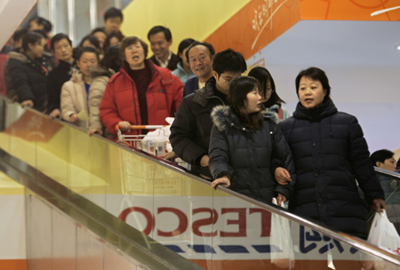 Customers take the escalator at a newly opened Tesco supermarket in Beijing January 26, 2007. Despite several high profile emerging-market exits by Wal-Mart Stores Inc, Ahold NV, and Carrefour, retailers will continue moving into developing nations such as India and China, a market research firm predicted, China Daily reported. [Reuters]