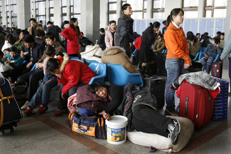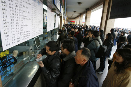 Travellers queue to buy tickets at Beijing Railway Station February 4,