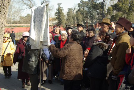 at the central Beijijing's Jjingshan Park.Beijingers fond of singing are in race