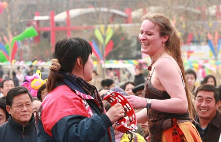 A foreign performer plays with a Chinese visitor at the Beijing Chaoyang Park Temple Fair Feb.24,2007,the last day of Spring Festival holiday in Beijing.[newsphoto]