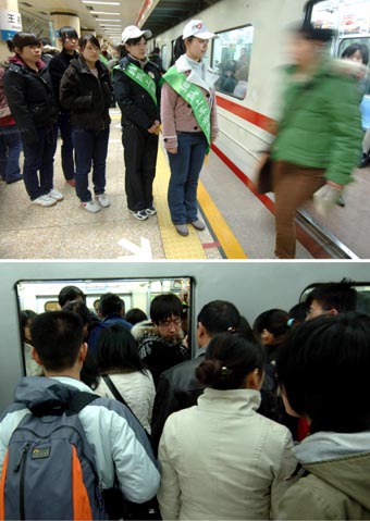 The lower photo shows commuters board metro without lining up at Beijing Fuxingmen metro station Beijing on Sunday, March 11, 2007. The upper one shows a line of passageners is queuing to get on with the guide of volunteers at Wangfujing metro station Beijing yesterday.The same day was declared the second official "Queue Day" in Beijing to remind residents of the benefits of lining up for things. Experts say the days should be introduced in other cities to provide people with a better understanding of social etiquette. [Xinhua]