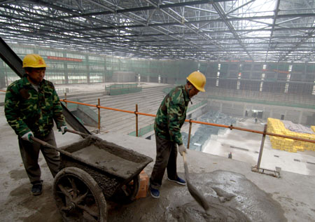Laborers work at the construction site of the University of Science and Technology Beijing Gymnasium, March 25. The gym is set to be finished before August 25 this year, and will be hosting judo and taekwondo events during the 29th Olympic Games . [Xinhua]