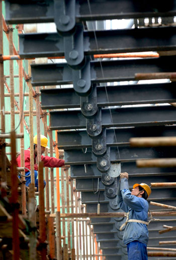A laborer works at the construction site of the University of Science and Technology Beijing Gymnasium, March 25. The gym is set to be finished before August 25 this year, and will be hosting judo and taekwondo events during the 29th Olympic Games . [Xinhua]