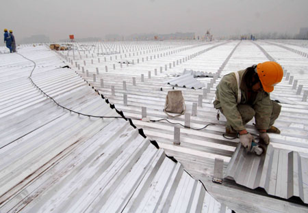 A laborer works on the roof of the University of Science and Technology Beijing Gymnasium, March 25. The gym is set to be finished before August 25 this year, and will be hosting judo and taekwondo events during the 29th Olympic Games . [Xinhua]