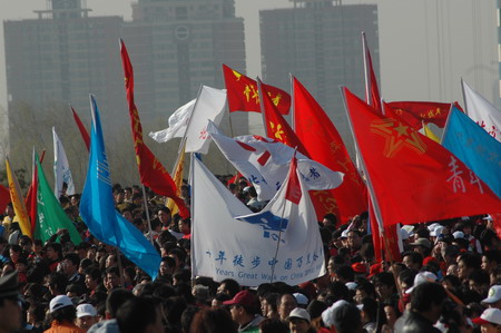 Beijing International Long Walk Carnival to mark the 500-day countdown to the Olympic Games--Volunteers display a huge Olympic flag in Beijing, March 25, 2007.