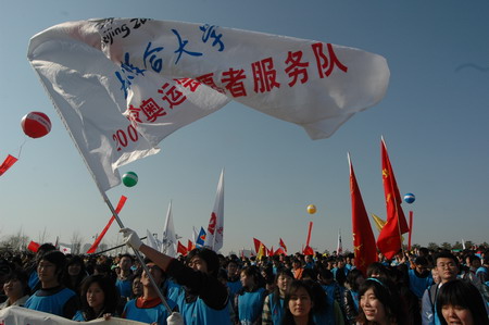 Beijing International Long Walk Carnival to mark the 500-day countdown to the Olympic Games--Volunteers display a huge Olympic flag in Beijing, March 25, 2007.