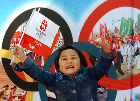 A boy waves flags at the promotion activity for Olympic sailing event in Qingdao of east China March 25, 2007. [Xinhua]