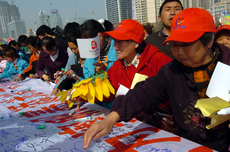 Qingdao citizens sign to support Olympic sailing event in Qingdao at the event promotion activity March 25, 2007. [Xinhua]