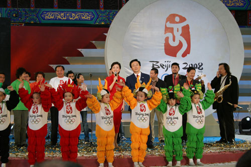 Kids in Fuwa costumes waving farewell to audience at the unveiling ceremony of the Beijing 2008 Olympic medals in Captital Museum, March 27, 2007. [chinadaily.com.cn]