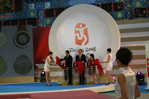 Assistant Director of the General Administration of sports of China Cai Zhenhua, BOCOG's executive vice president Jiang Xiaoyu and Deng Yaping, a former table tennis Olympic gold medallist (L-R) unveil the Beijing Olympic medals during the launching ceremony in Beijing March 27,2007.[chinadaily.com.cn]