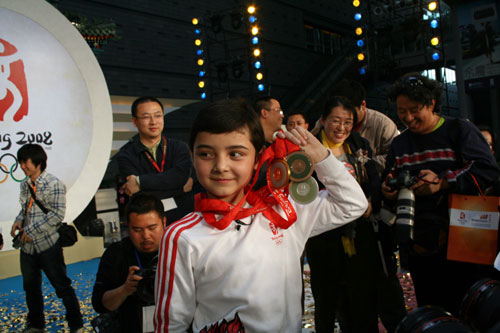 holding the chosen design of Beijing Olympic medals, in Capital Museum on March