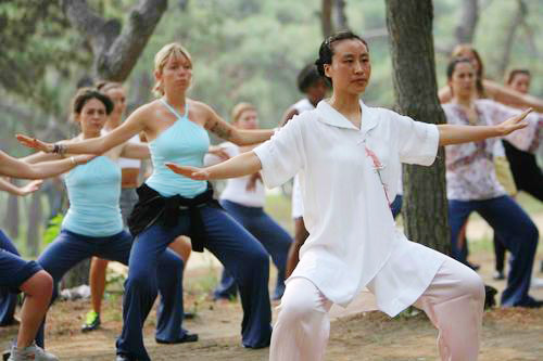 Foreigners practice Tai Chi in Beijing