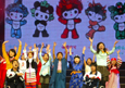 A woman gestures in front of 2008 Beijing Olympic mascots during the launching ceremony of "Green Dreams, Colorful Olympics" 2007 International Painting Contest for primary and middle school students at a park in Beijing April 13, 2007. [Reuters]
