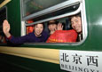A staff member stands at attention as a high-speed train leaves Beijing railway station April 18, 2007. High-speed trains with a speed of 200km (124 miles) per hour or more will hit Chinese railways on Wednesday, marking the start of the system's sixth "speed boost", which has been hard pressed to cope with an increased demand for a bigger transport capacity, Xinhua News Agency reported. [Reuters]