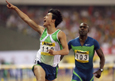 Liu Xiang of China (L) and Allen Johnson of the U.S compete in the 110 meters hurdles during the Shanghai Golden Grand Prix athletics meet in Shanghai September 23, 2006.[Reuters]