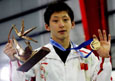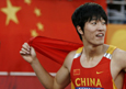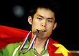 Gold medallist Yang Wei of China (C) stands on the podium during the national anthem of China following the men's individual all-around final at the 39th Artistic Gymnastics World Championships in Aarhus, Denmark, October 19, 2006. [Reuters]