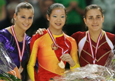 Gymnasts from China celebrate their gold medals win on the podium following the men's team final at the 39th Artistic Gymnastics World Championships in Aarhus, Denmark, October 17, 2006.