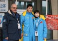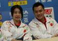 Figure skating Olympic and world silver medalists Zhang Dan (R) and Zhang Hao of China pose for a photo with the officer in charge of Turin winter universiade athletes' villiage after Chinese delegation's flag-rising ceremony in Turin, Italy, Jan,16,2007.The Chinese delegation for the 23rd World Winter Universiade held the flag-rising ceremony in the athletes'villiage.[Xinhua]