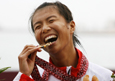 Chinese divers Jia Tong (L) and Chen Ruolin bite their gold medals after winning the women's 10-metre synchro platform competition at the World Aquatics Championships in Melbourne March 19, 2007. [Reuters]