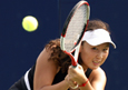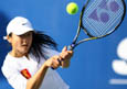 Peng Shuai of China chases a shot by Sybille Bammer of Austria at the Pattaya Women's Open tennis tournament in Pattaya, Thailand February 10, 2007. [Reuters]